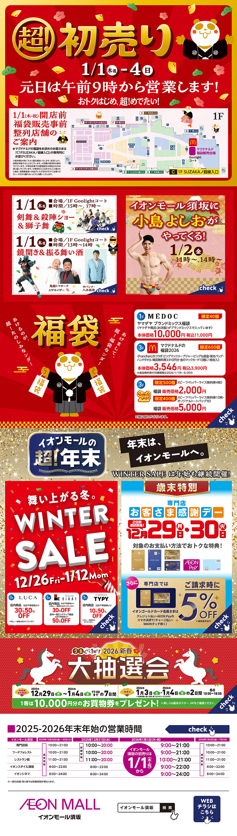 マクドナルド福袋販売会場マップ 剣舞&殺陣ショー&獅子舞 鏡開き&振る舞い酒 イオンモール須坂に小島よしおがやってくる! 福袋 ウィンターセール 歳末特別専門店お客さま感謝デー 新春大抽選会 年末年始の営業時間 WEBチラシはこちら イオンモール須坂ホームページ